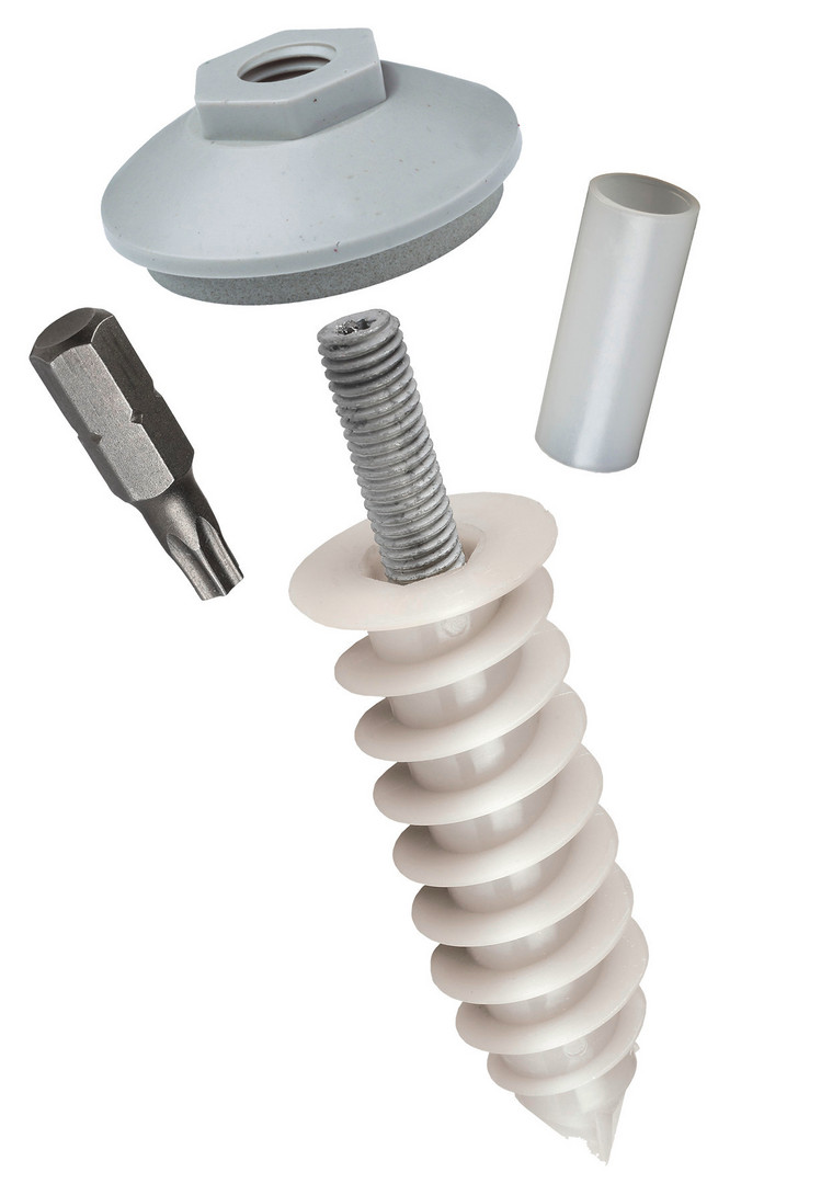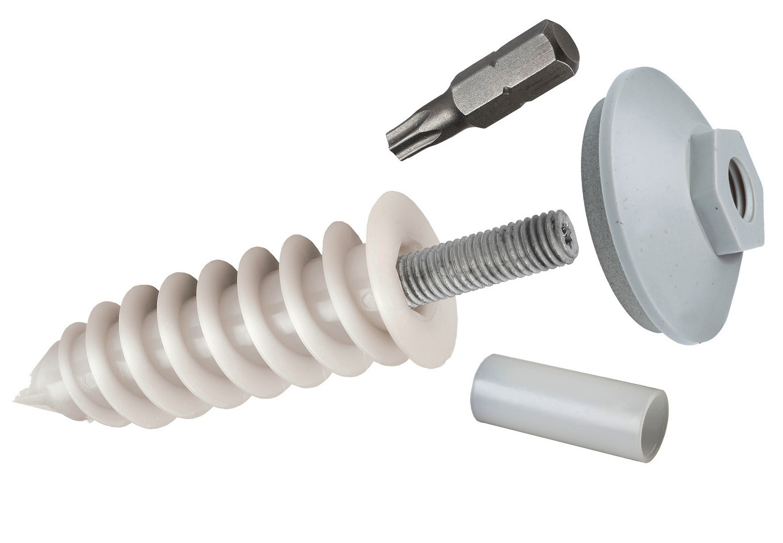 Umkarton à 5 Sets im Polybeutel. 1 Set besteht aus: 5 Stk. Dämmstoffdübel mit Anschlussgewinde, M10 x 30 Stahl, feuerverzinkt 5 Stk. Dichtungsrosette mit Schraubenansatz zum Aufschrauben 5 Stk. Schutztülle 1 Stk. Bit TX 25