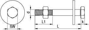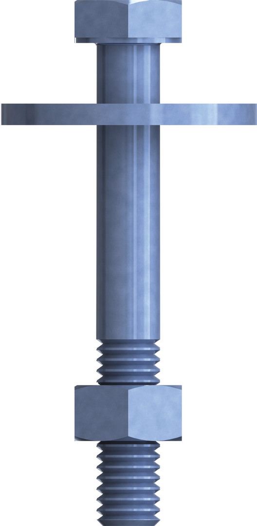 Mit Mutter DIN 934 Ø M 10 mm und Scheibe DIN 9021 Ø 10,5 mm.