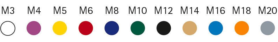 Gewindestangen nach Durchmesser farbig markiert. Stahl-Gewindestangen gebündelt: M3 - M5 je 20 Stk., M6 - M12 je 10 Stk., M14 - M20 je 5 Stk.