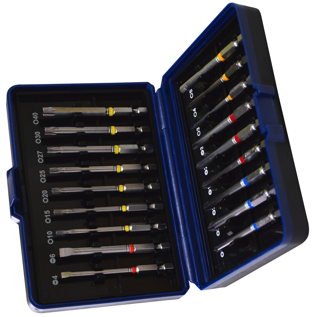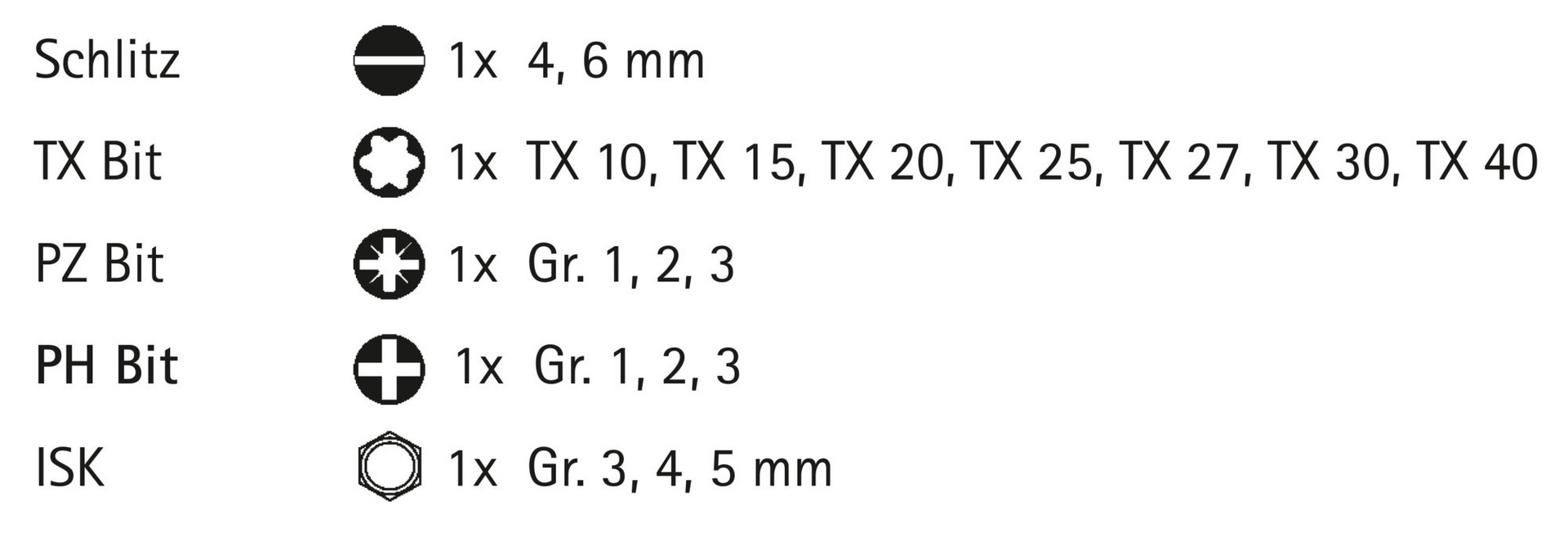 Farbig markierte Bits aus S2-Stahl erleichtern das Suchen der richtigen Antriebsgröße. Inhalt: Schlitz: 1x 4, 6 mm TX Bit: 1x TX 10, TX 15, TX 20, TX 25, TX 27, TX 30, TX 40 PZ Bit: 1x Gr. 1, 2, 3 PH Bit: 1x Gr. 1, 2, 3 ISK: 1x Gr. 3, 4, 5 mm