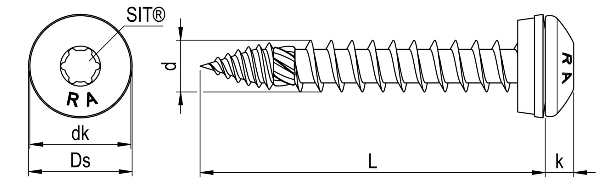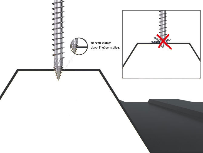 Bohrschraube für spanfreies Verschrauben von Aluminium- und Stahlprofilblechen auf Holzunterkonstruktionen.