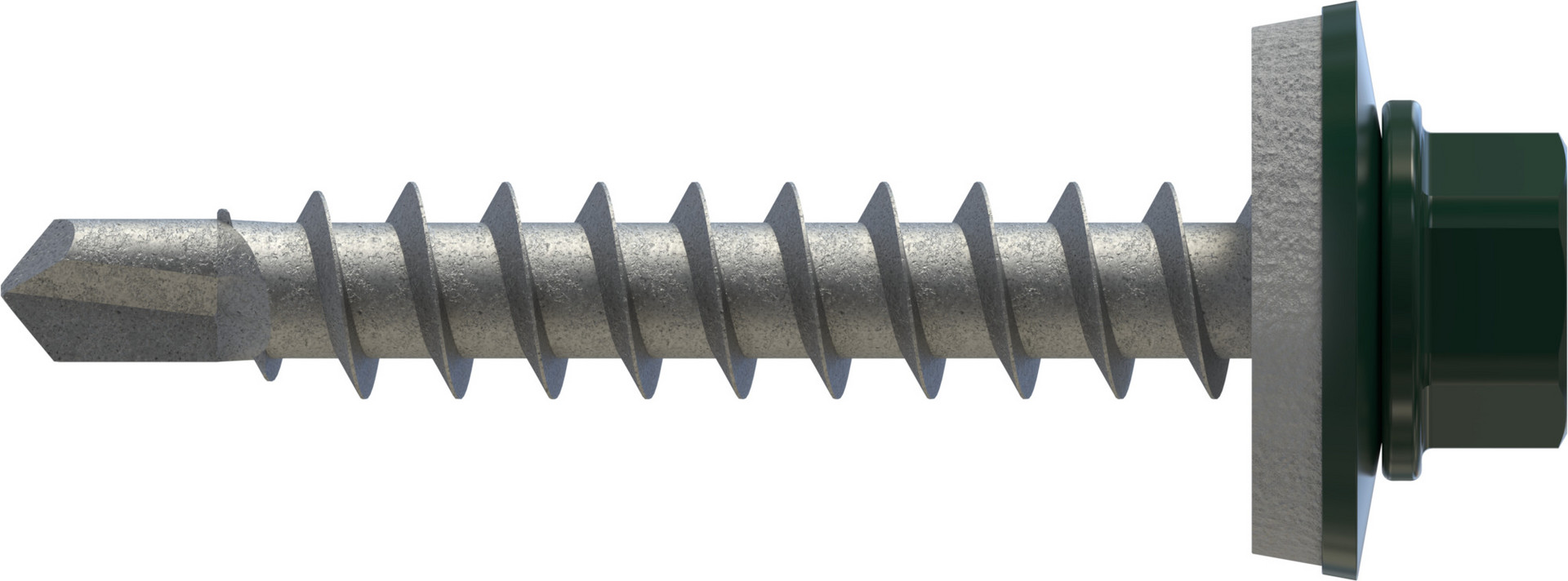RP-r Bohrschraube, Sechskantkopf mit angepresster Scheibe, 6,0 x 38 mm, Vollgewinde, SW 8, E16, Bimetall (Edelstahl A2/Stahl), RUSPERT®, RAL 6005, ETA-21/0306, 100 Stk.